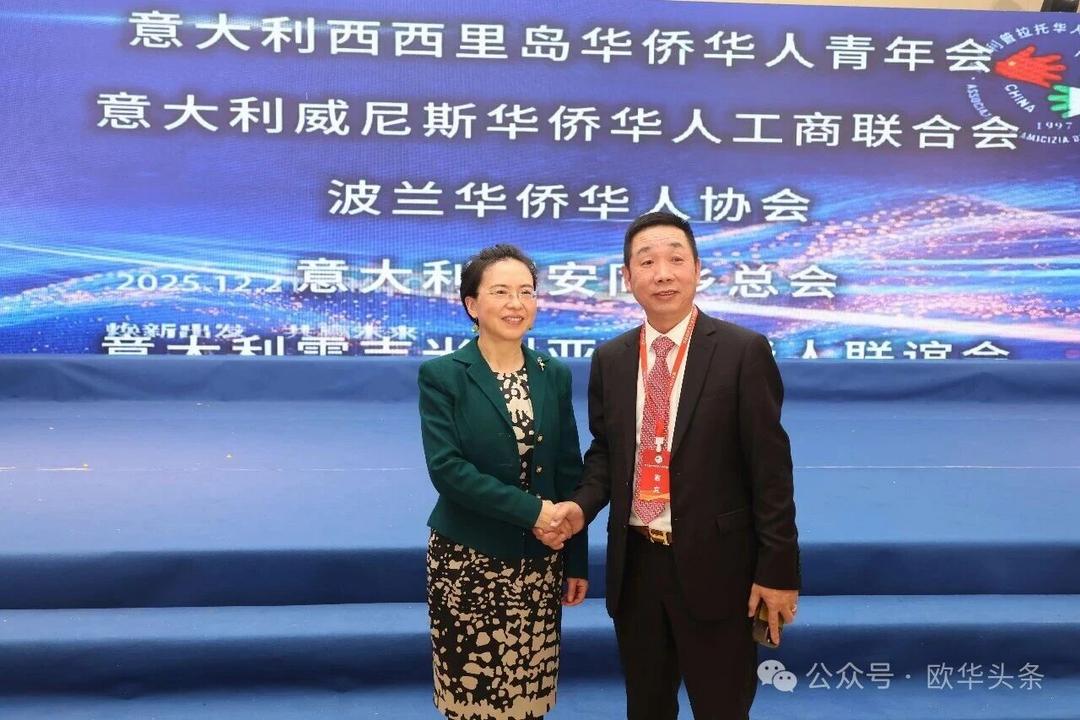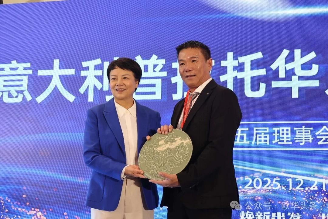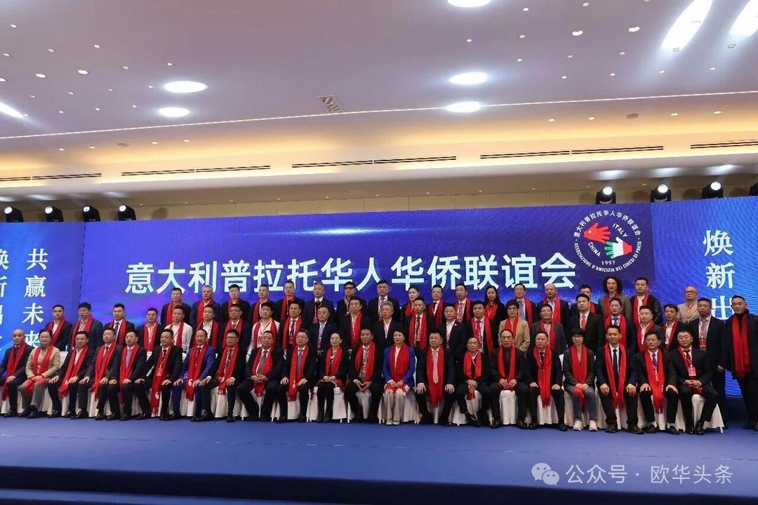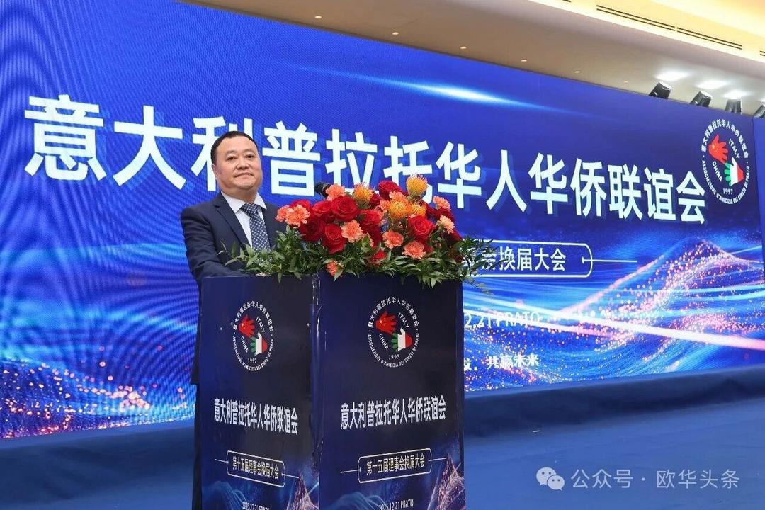 (陈静)2025年12月21日,意大利普拉托华人华侨联谊会第十五届换届庆典大会在当地的东方明珠大酒店隆重举行。中国驻佛罗伦萨总领事尹琦、浙江海外联谊会副会长鲍秀英、温州市侨联副主席董邦云等中意政要,中资机构代表、中意各界友好人士,以及来自意大利各地的华侨华人和普拉托华人华侨联谊会历届会长及会员代表近500人齐聚一堂,共同见证这一重要时刻。