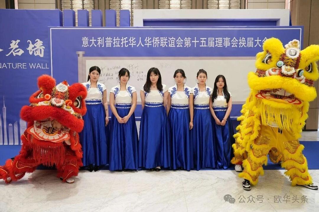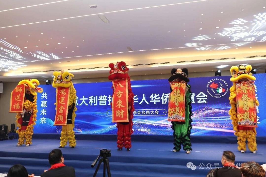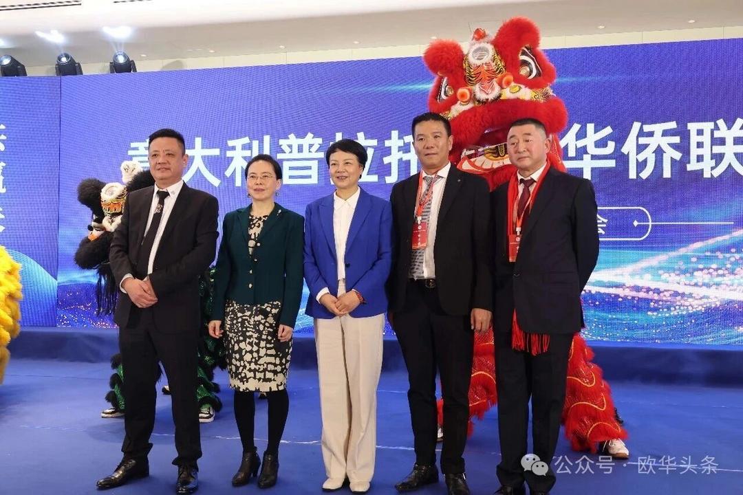 新任会长陈洲、中国驻佛罗伦萨总领事尹琦、浙江海外联谊会副会长鲍秀英,以及联谊会第一常务副会长吴建林、执行会长张建光共同登台,为祥狮点睛,寄托对普拉托华人华侨联谊会未来发展的美好祝愿。