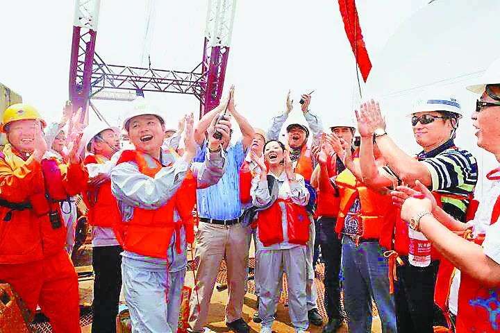 △2016年7月,由林东团队历时8年研发的LHD海洋潮流能发电项目首期1兆瓦机组在舟山顺利下海,林东和同事一起庆祝