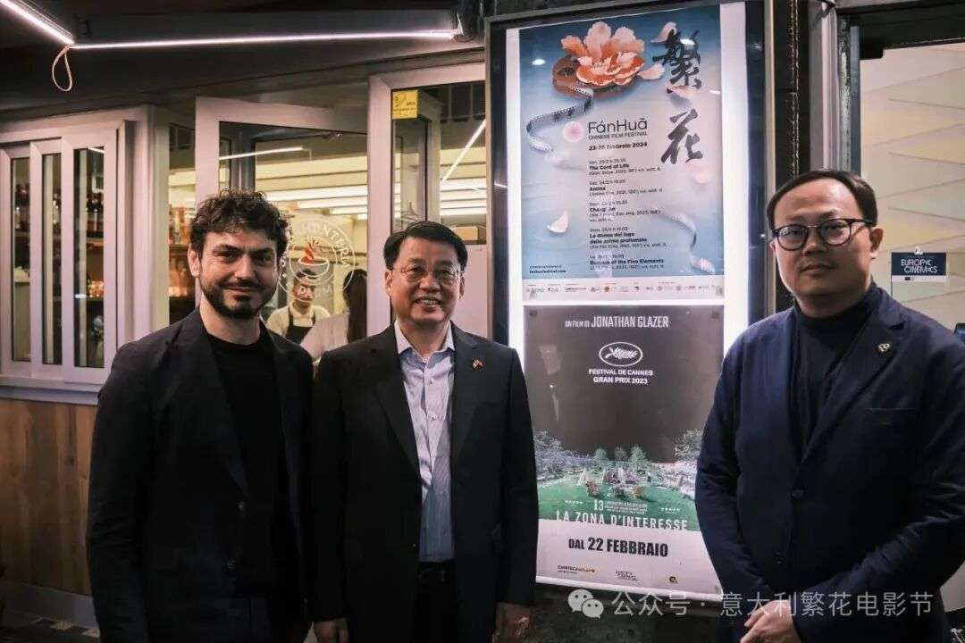 从左至右:米兰市文化局局长托马斯·萨奇、中国驻米兰总领事馆刘侃总领事、意大利繁花电影节主席张修中