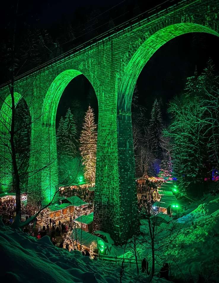 拉文纳峡谷圣诞市场,位于德国黑森林的深处,被誉为德国最浪漫的圣诞市场,也是欧洲最有氛围、最独特的圣诞市场之一。其标志性建筑,是高达40米的霍伦塔尔(Höllental)铁路高架桥,在五彩缤纷的圣诞灯光映照下,大桥呈现出独一无二的梦幻景象。在高架桥下,有着40个圣诞摊位,出售着当地的手工艺品和黑森林特色美食。