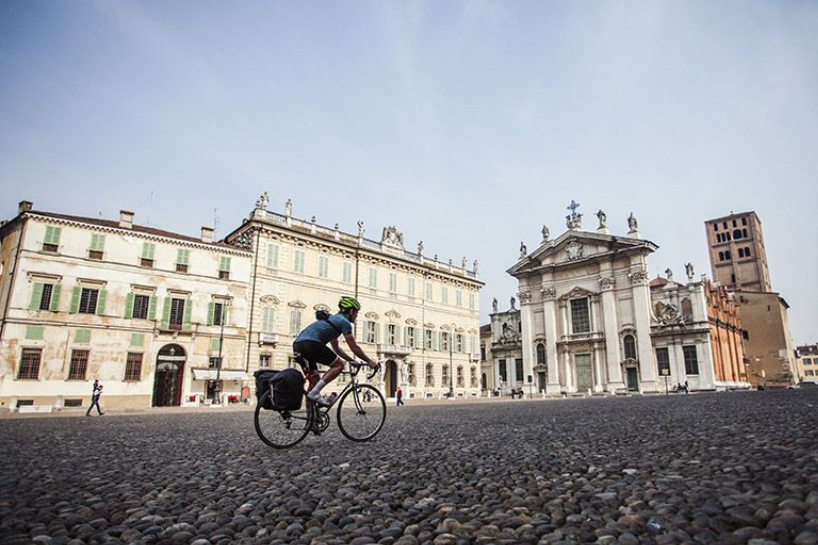 环意赛路线会经过意大利众多地区,展示当地美景。图为自行车手骑过伦巴第地区的城市。(图片来源:2021年环意赛官网截图)