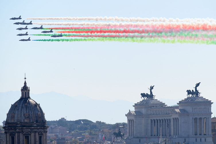 4月25日,意大利“三色箭”飞行表演队在罗马举行的“解放日”纪念仪式上喷出代表意大利国旗颜色的红白绿三色烟雾。(图片来源:新华社)