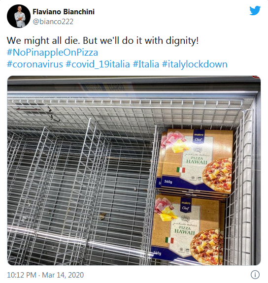 在披萨上面放乱七八糟的料,绝对会引发意大利人的愤怒,疫情期间,意大利人即使饿死也不会拿起夏威夷披萨这种黑暗产物。