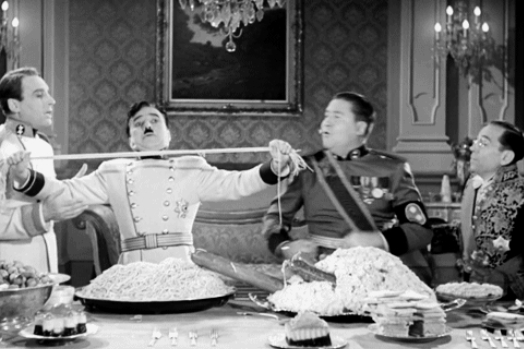 在卓别林的电影《大独裁者》之中,由卓别林本人扮演,映射希特勒的希克激怒嘲讽来访的意大利领袖的方式就是抓着一堆意面玩命拉扯。