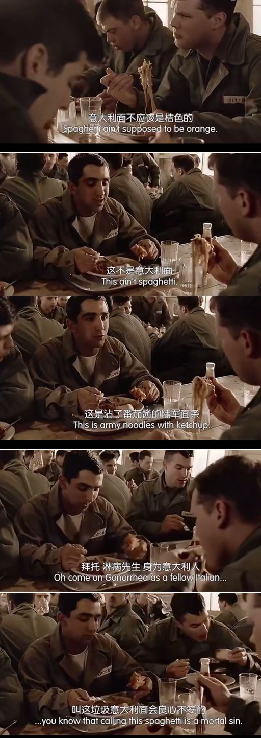 在美剧《兄弟连》中,意大利裔士兵难得加一次餐,该吐槽的也必须要说: