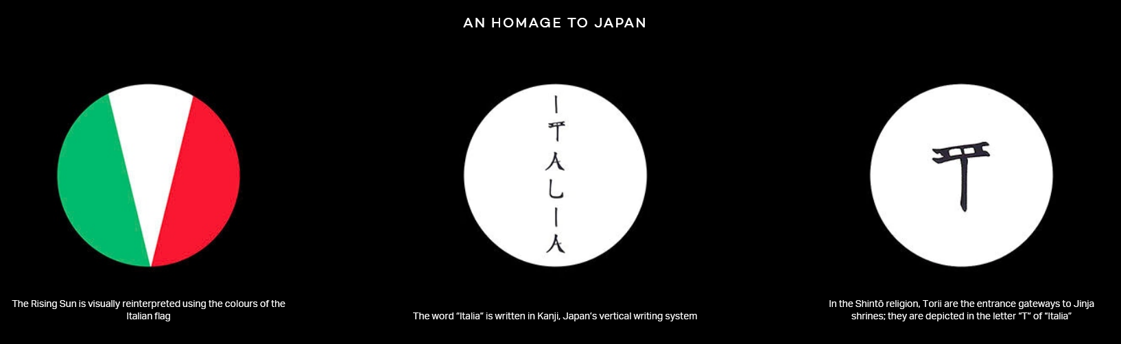 这套队服的设计主要突出三个向东道主日本致敬的元素,一是意大利国旗被重新设计成日本朝阳圆形,二是以日本汉字垂直书写系统书写的Italia书法体字符,三是以日本神社牌坊形式的T字母。