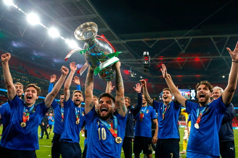 2020欧洲杯夺冠后,意大利队球员举起奖杯庆祝。(图片来源:新华社)