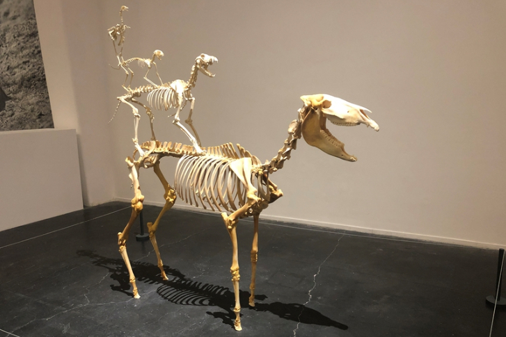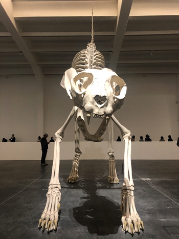 进入展厅,迎面而来的是一具巨大的动物骨架,这件作品是卡特兰对菲尔德自然史博物馆的镇馆之宝——恐龙化石“苏”的回应。