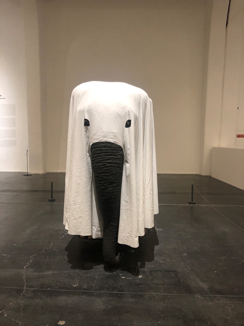 在门口左边,一只小象身披白色被单呆立着,露出疯狂而偏执的眼睛,吓人而可笑。卡特兰十分喜欢玩这种并置游戏。在巨大的反差与冲击中,他出于动物保护的角度,讽刺了当下马戏团中让大象这种崇高而庞大的动物表演杂耍的现象。