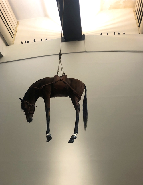 在展厅中央,这匹马似乎是在代替人类接受苦难的折磨。这是卡特兰由动物保护主义者而来的灵感,也是对自己天主教成长背景的反抗。