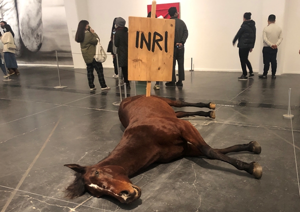 两年后,他又一次以马为主角,这一次,马匹终于脱去了“原罪”的外衣,化身为耶稣,身上插着的木牌写着拉丁文缩写INRI,即“犹太人的君王,拿撒勒人耶稣’。”这句话是犹太的祭司们在戏弄被钉上十字架的耶稣。