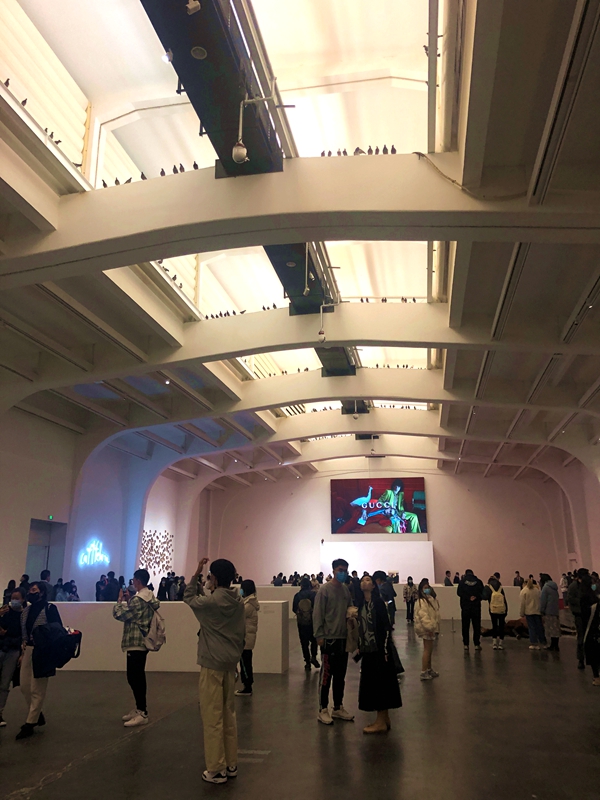UCCA门前是醒目而简洁的海报——灰色胶带把一根长了黑色斑点的香蕉贴在米白色的墙壁上。路过的人们见到无不发笑。拐进UCCA的玻璃门向右转,长长的队伍已经排了起来。远远看去,一只巨型猫的骨架在门内呲牙咧嘴,仿佛露出笑容。