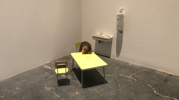 “我惊异于人们看到我的作品都会发笑,或许面对死亡,发笑才是一种本能。”卡特兰的大多数作品都在思考人类的终极命题。在展厅某处小角落里,堆满碗碟的水槽、淡黄的餐桌、家庭最常见的小玻璃杯共同营造了温馨的氛围,小松鼠似乎是结束了一天的工作,在吃完晚饭后趴在餐桌上舒服地歇息,而在它脚边,不仔细看不会发现的一把手枪,透露了这个作品的悲剧底色。