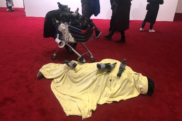 也许是因为出身底层,处在社会下层的流浪者,是卡特兰多次塑造的对象。本次展出的作品中,艺术家将场景转移到了北京街头,在一个寻常的街边,流浪汉在深冬的寒风中裹紧了自己的薄被。好像并没有人关心他叫张三还是李四,因为在大家眼里他只是个不幸的人。