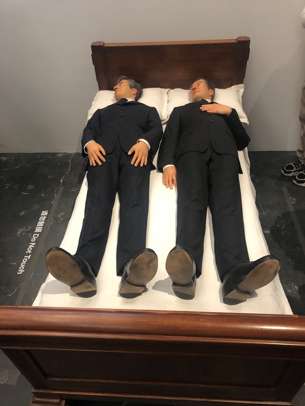 卡特兰不仅用动物阐释死亡,也常常使用自己。在《我们》中,他将两个僵直地躺在床上的人体雕塑换上了自己的面孔。