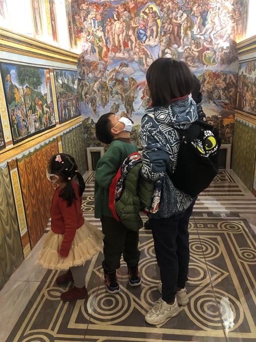 与放大猫骨骼的做法相反,艺术家把神圣殿堂中的图像缩小了数倍。在梵蒂冈,米开朗琪罗创作的壁画巨大无比,是为了让人感到神的伟大,这艺术是属于神的。但卡特兰认为艺术是属于人,并且是属于人的现世的——他将壁画缩小,让观众能够近距离观察这幅杰作,高喊着将艺术还给人。