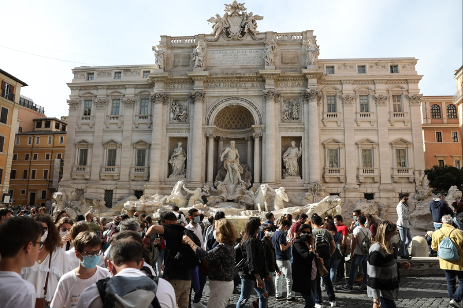 游客在意大利首都罗马的许愿池前游览。(图片来源:新华社)