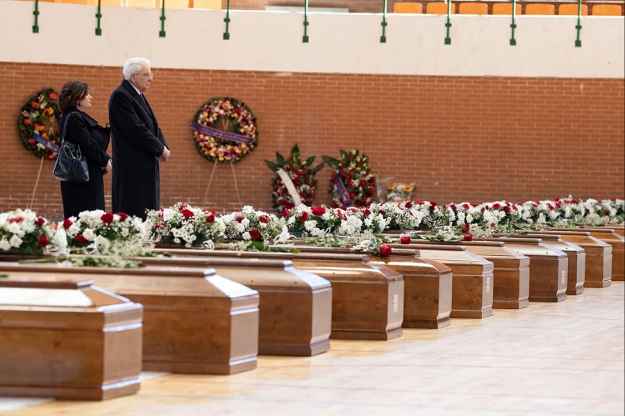 意大利总统马塔雷拉(右)悼念移民船沉没事故遇难者。(图片来源:新华社)