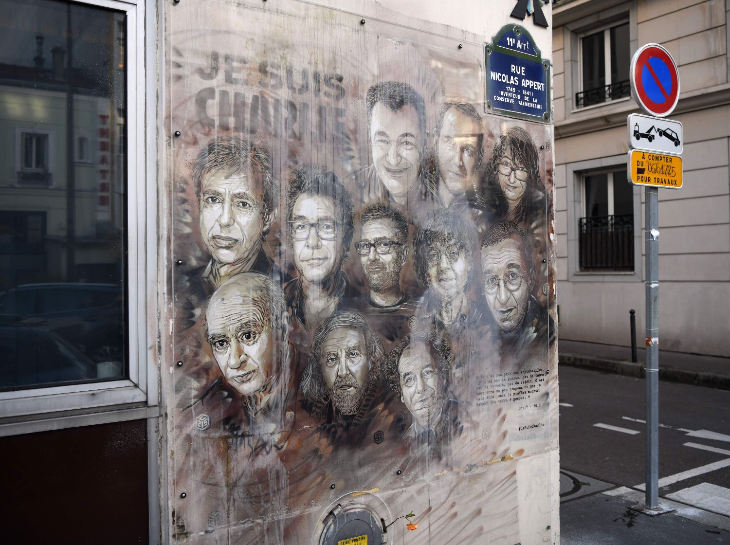 由涂鸦艺术家克里斯蒂安·奎米创作的壁画仍被安放在街角,这幅壁画描绘了袭击事件中的遇难者形象。(图片来源:中新社)