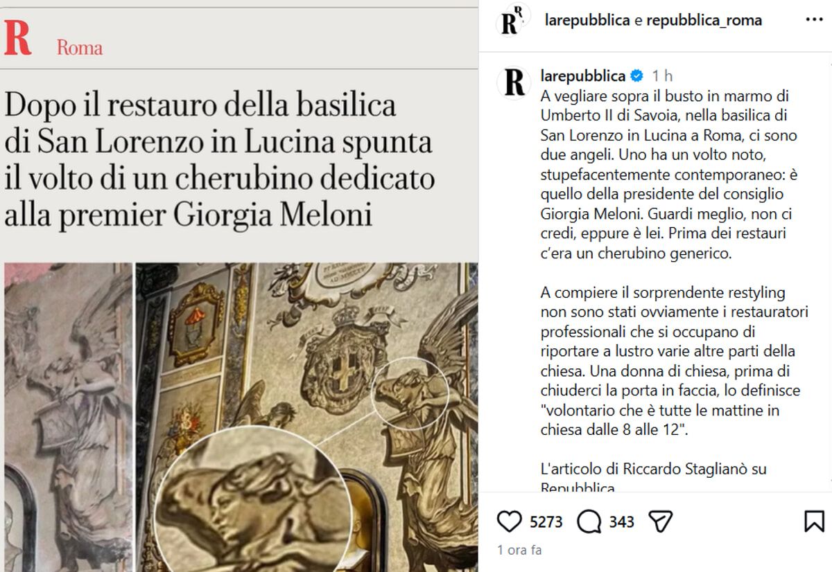 罗马市中心的圣洛伦佐·卢奇纳大教堂(Basilica di San Lorenzo in Lucina)近期修复后,一个小天使(cherubino)的面容引发争议。原本具有传统天使通用特征的面孔,如今被认为与意大利总理乔治亚·梅洛尼(Giorgia Meloni)的面容惊人相似。
