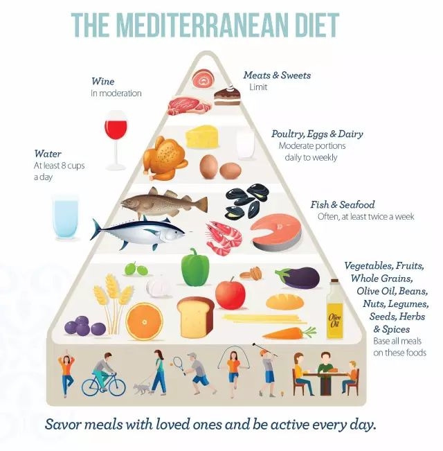 具体来说,地中海饮食建议人们每日食用6-12份水果与蔬菜;4-6份谷物;1-3份乳制品;1-2份家禽、鱼类、贝类;并建议每日摄取一杯红酒,一些坚果,饮用至少8杯水;至于牛羊肉等红肉和甜食,要留到特殊场合才吃。此外,最重要的是,做饭的时候要用很多橄榄油进行烹饪。