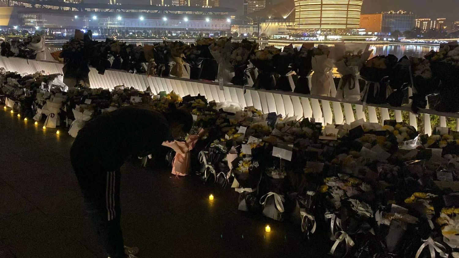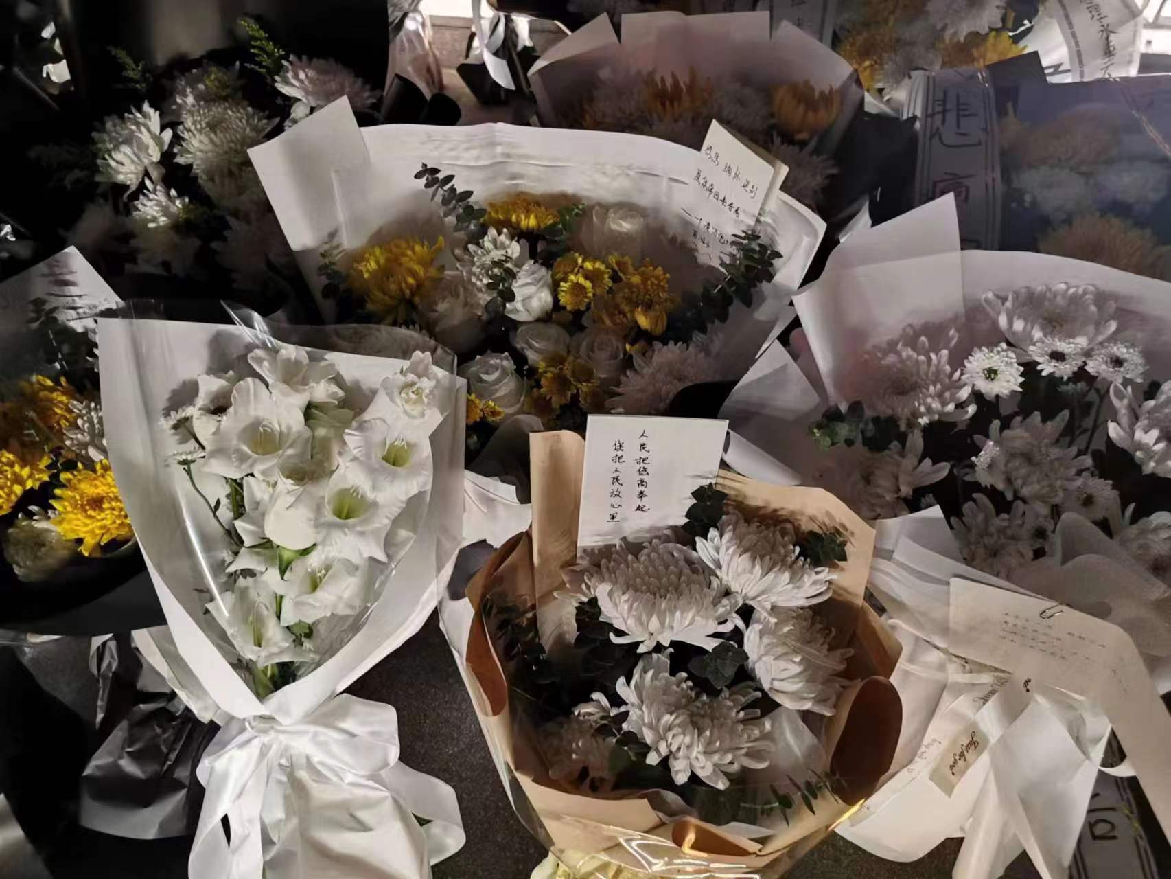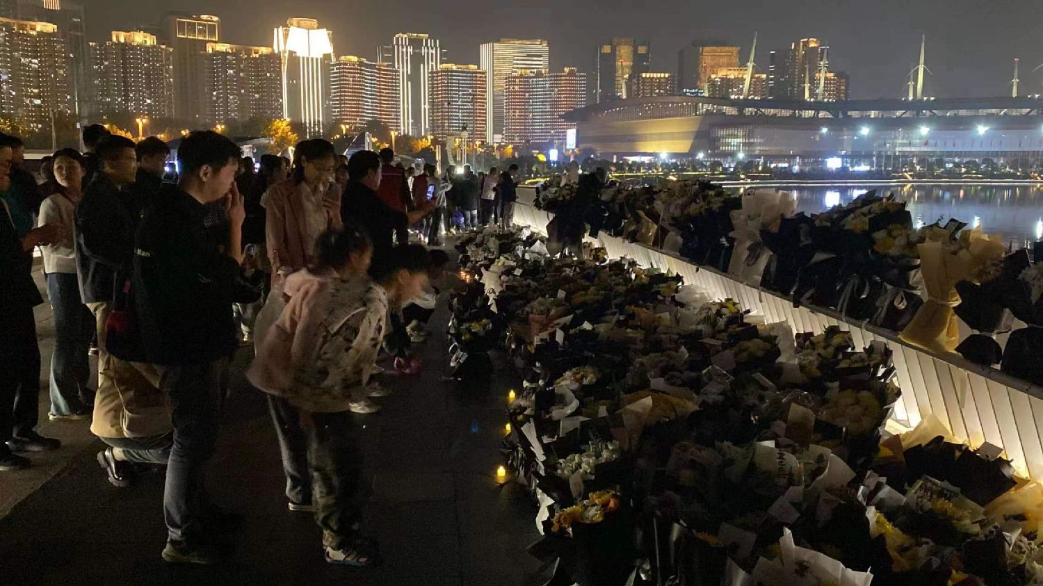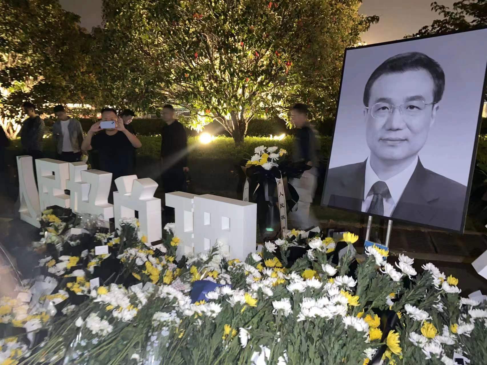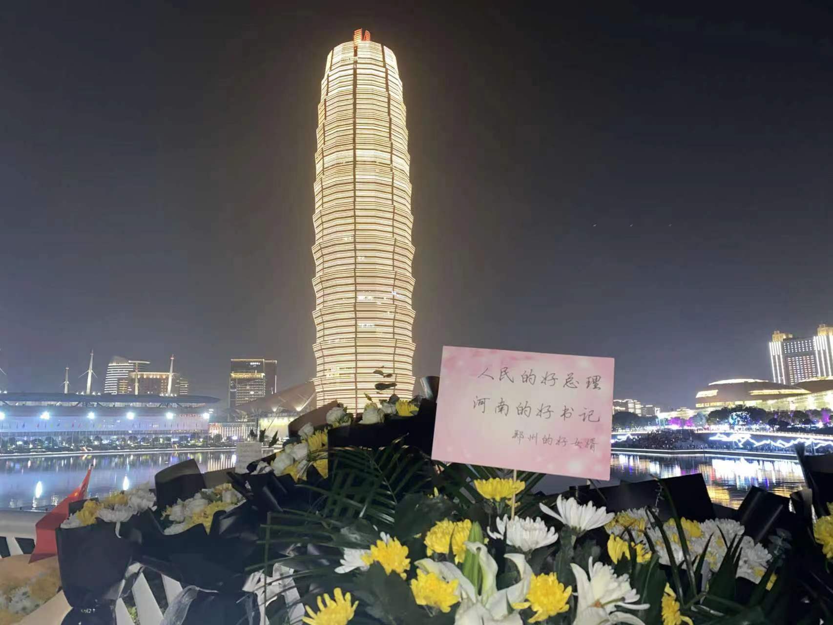 北京时间10月28日晚,河南省会郑州市郑东新区如意湖文化广场,民众摆放鲜花悼念因病去世的中国国务院原总理李克强。后者曾在河南主政多年,是郑东新区整体规划的倡导者和拍板者。