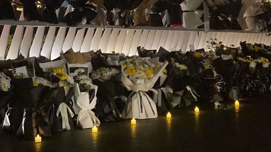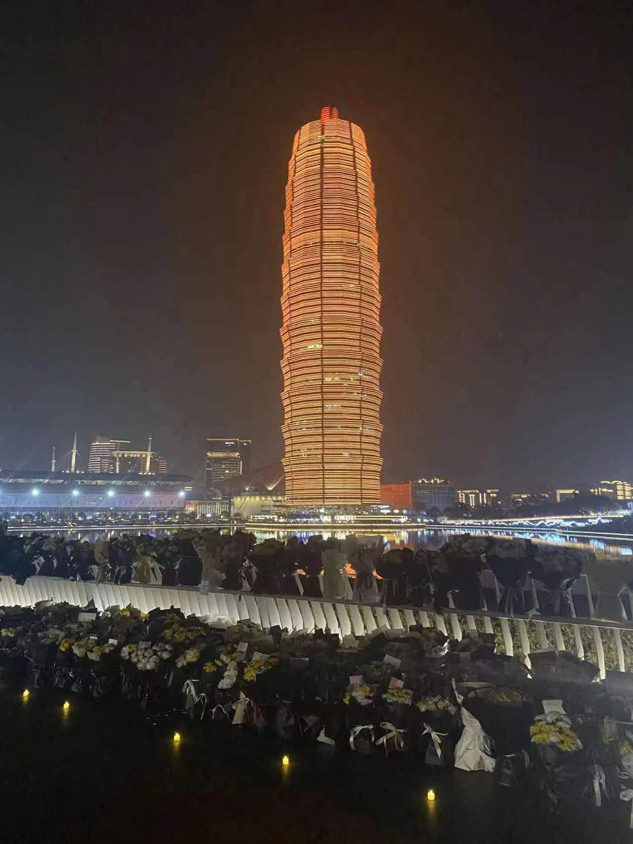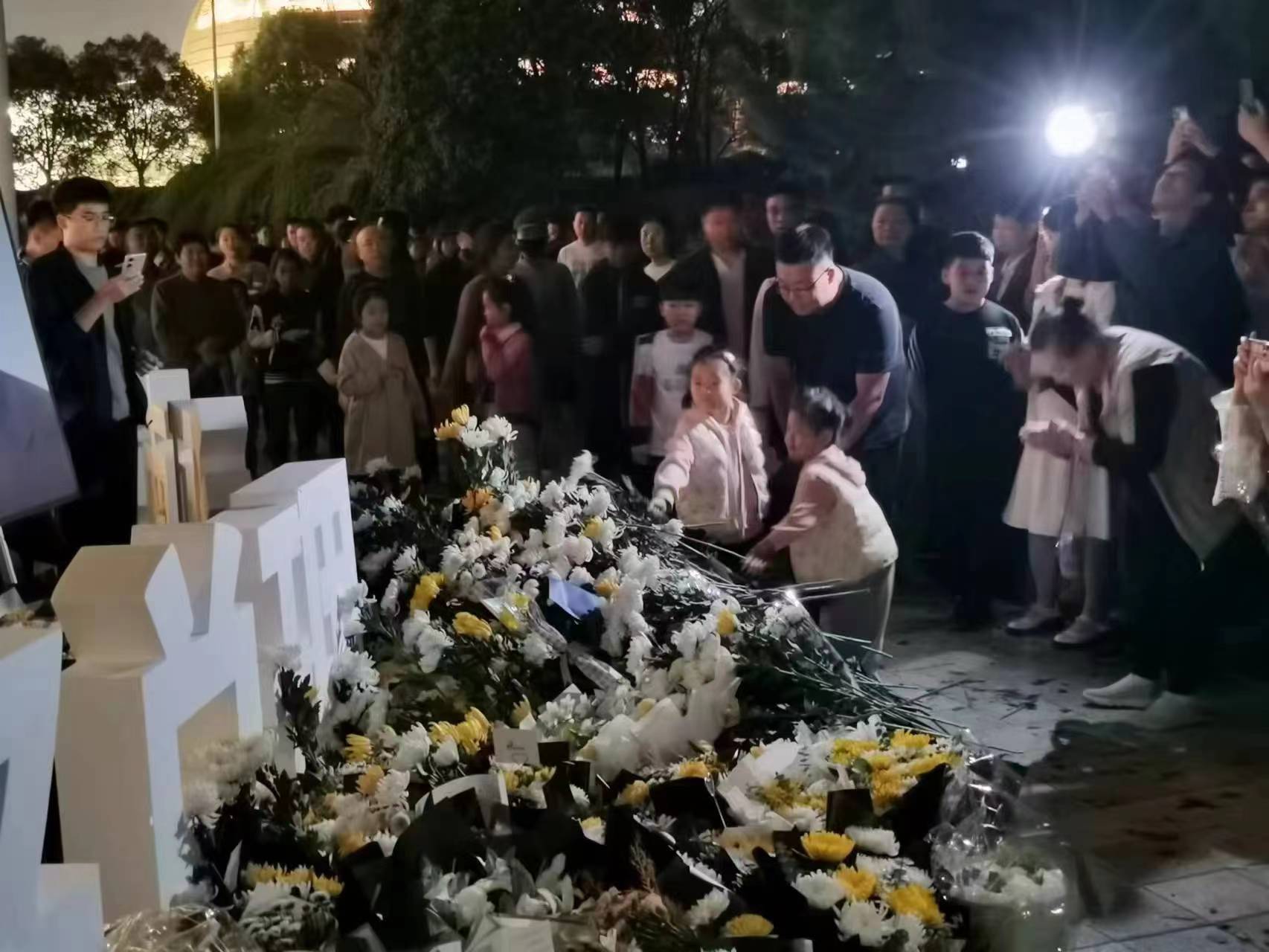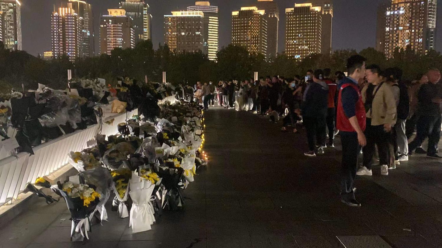 10月28日晚,河南省会郑州市郑东新区如意湖文化广场内,民众摆放鲜花悼念因病去世的国务院原总理李克强。图为悼念现场。(图片来源:本文图片均自钟豫博 摄)