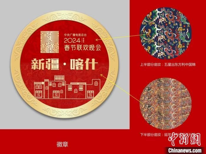 图为中央广播电视总台《2024年春节联欢晚会》喀什分会场纪念徽章设计图。(图片来源:中新网)