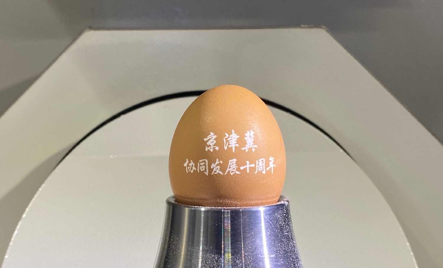一枚生鸡蛋上,“京津冀协同发展十周年”的字样逐渐显露出来。这是北京精雕科技集团有限公司(下称精雕科技)自主研发的五轴数控机床,通过主轴刀头每分钟1.8万转的速度,在厚度为0.3毫米到0.4毫米的蛋壳上雕刻的“成果”。