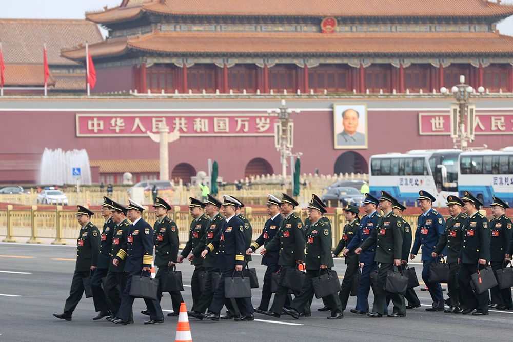 3月4日,十四届全国人大二次会议在北京人民大会堂举行预备会议。图为解放军和武警部队代表团走向人民大会堂。(图片来源:中新社)