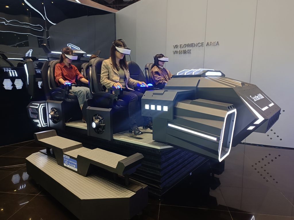 3月12日,参观者在中科智谷的VR体验区感受“科技风”,图为戴上VR眼镜体验“时空穿越”。(图片来源:中新社)