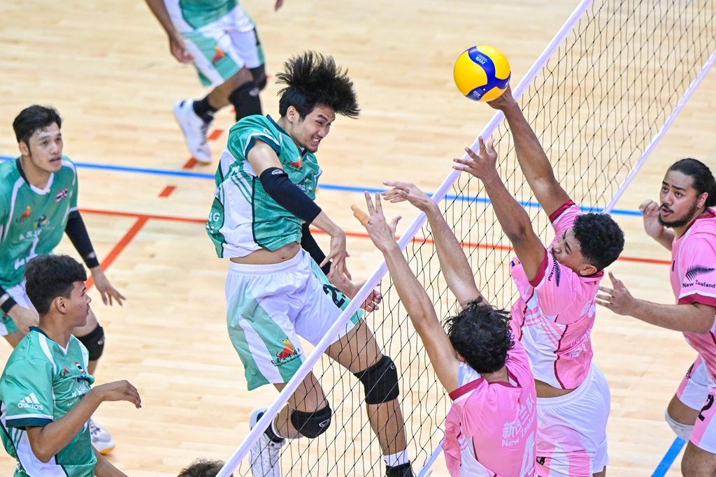 4月6日,第三届文昌排球节九人排球邀请赛,来自泰国的球队(左)对战来自新西兰的球队(右)。(图片来源:中新社)