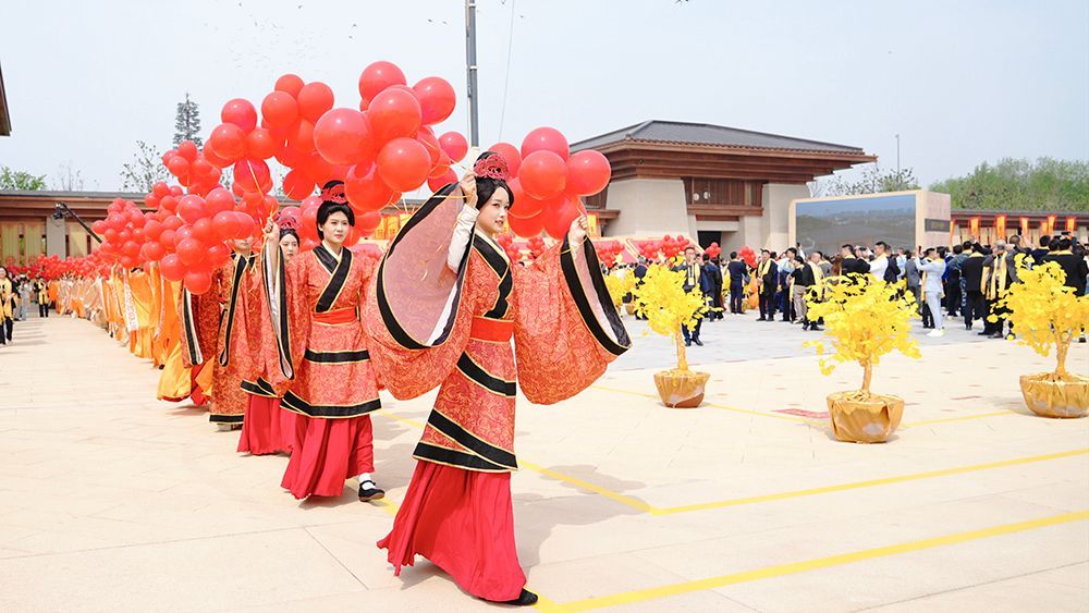 中新社报道,4月的新郑,春光融融,花红柳绿。为迎接盛典,黄帝故里园区焕然一新,旗幡猎猎。当镌刻着“迎天下华人归故里拜祖”字样的竹简书卷状大门徐徐开启,佩戴着黄色丝巾的拜祖嘉宾们依次进寻根门、经系祖坛、上轩辕桥、过故里祠,伴随着“八佾舞”以及编钟、古筝演奏等节目,甲骨碑林四方柱、石雕盘龙柱、杜岭方鼎、篆书竹简等依次呈现,为嘉宾和观众献上视听盛宴。行至拜祖广场,随着轩辕殿前黄色帷幕缓缓升起,黄帝塑像尊容亮相。