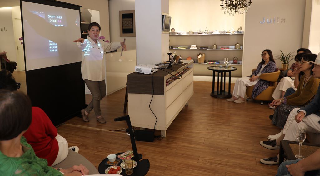 5月10日,台湾知名艺术史学者朱惠良在台北一个文化沙龙讲述昆曲艺术。图为朱惠良现场清唱《牡丹亭》名段。(图片来源:中新社)