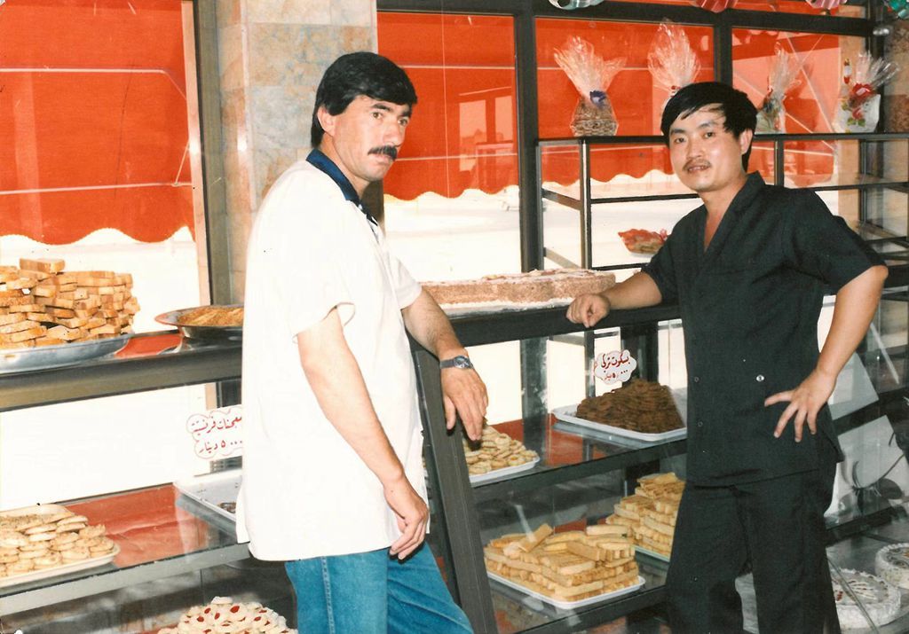 1984年,廉守柱(右)在土耳其传授白吉馍制作技艺。(图片来源:中新社)