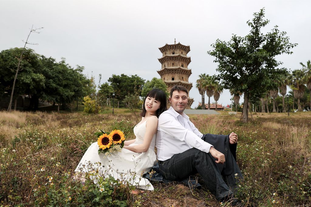 2021年4月5日,意大利摄影师艾罗斯与妻子林园园在福建泉州以六胜塔为背景补拍婚纱照。(图片来源:中新社)