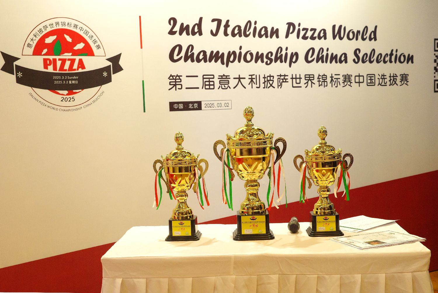 2025年3月2日,第二届意大利披萨世界锦标赛中国选拔赛在中国驻意大利使馆举办。图为3月2日,比赛现场拍摄的奖杯。(王木羊 摄)