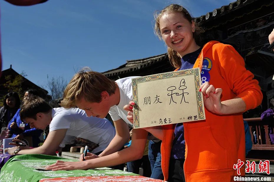 图为“汉语桥”选手学习东巴文。中新社记者刘冉阳摄