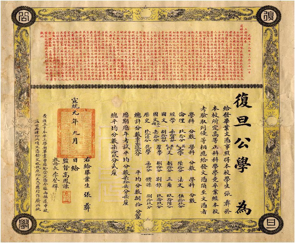 目前存世最早的复旦文凭。文凭的主人是复旦公学第二届毕业生张彝。2005年,张彝的孙子、复旦大学校友、知名物理学家张首晟于复旦百年校庆前夕将其捐赠给母校。