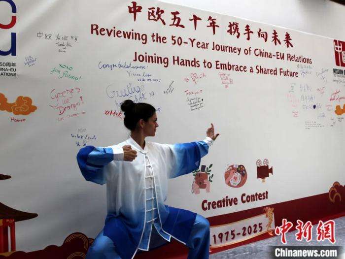 当地时间2025年4月28日,中国驻欧盟使团在比利时布鲁塞尔举行“中欧五十年携手向未来”主题创意大赛颁奖仪式。图为一名来宾摆出功夫造型,在颁奖会场留念。(图片来源:本文图片均来自中新网)