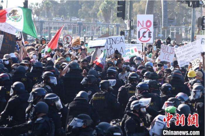 当地时间2025年6月8日,美国加利福尼亚州洛杉矶市中心爆发反搜捕非法移民行动抗议示威,抗议者与警方发生冲突。