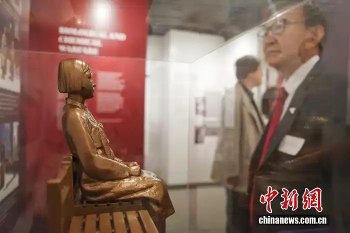 当地时间2024年6月8日,位于加拿大多伦多的亚太和平博物馆正式揭幕。该博物馆是全球首座以英语呈现亚洲二战历史的博物馆。图为观众在展馆内的韩国“慰安妇”少女雕像前驻足。(图片来源:中新社)