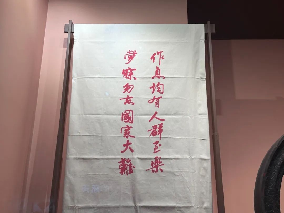在中国人民抗日战争纪念馆举办的《为了民族解放与世界和平——纪念中国人民抗日战争暨世界反法西斯战争胜利80周年》主题展览展出的3000余件文物中,一张印有“作息均有人群至乐,梦寐勿忘国家大难”联句的床单引人瞩目。