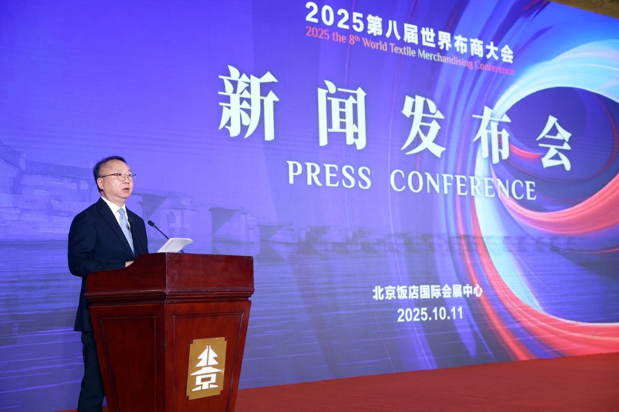2025年10月11日,中国纺织工业联合会会长孙瑞哲在第八届世界布商大会新闻发布会在发表讲话。