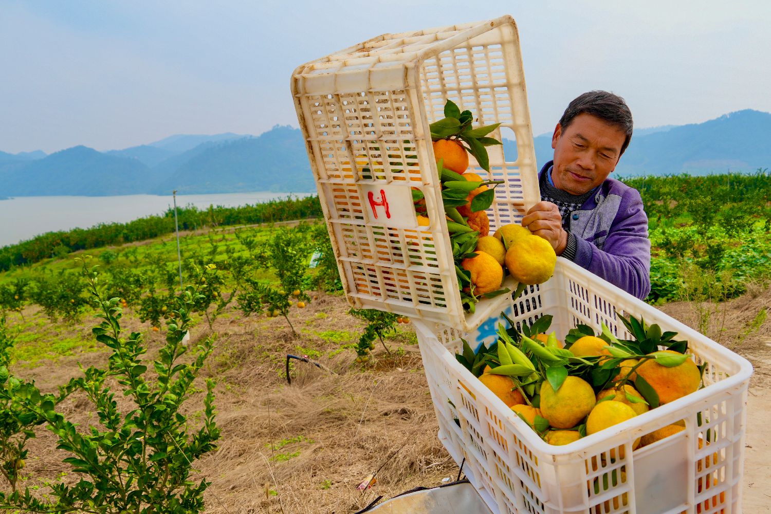 水库沿岸不少村镇的田间地头,民众忙碌着采收、售卖柑橘、猕猴桃等水果。图为10月23日,湖北省丹江口市习家店镇,果农准备将新鲜柑桔运往市场。