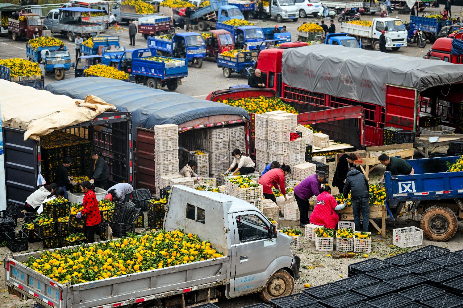 图为10月23日,桔农们驾驶着满载柑桔的车辆在湖北丹江口市习家店柑桔交易市场交易,市场一片繁忙景象。近期,当地柑桔进入销售旺季。