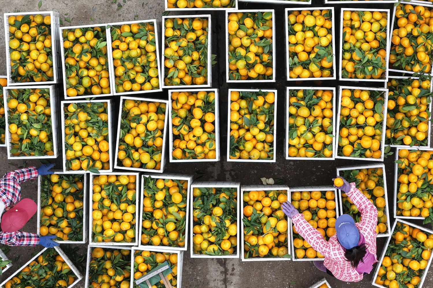图为10月23日,湖北丹江口习家店柑桔交易市场内,果农们将柑桔分拣装箱。近期,当地柑桔进入销售旺季。(无人机照片)