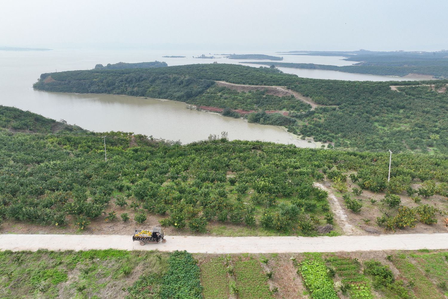 图为10月23日,湖北丹江口习家店镇,果农驾驶车辆满载成熟的柑桔,从丹江口水库边的果园驶向交易市场。(无人机照片)