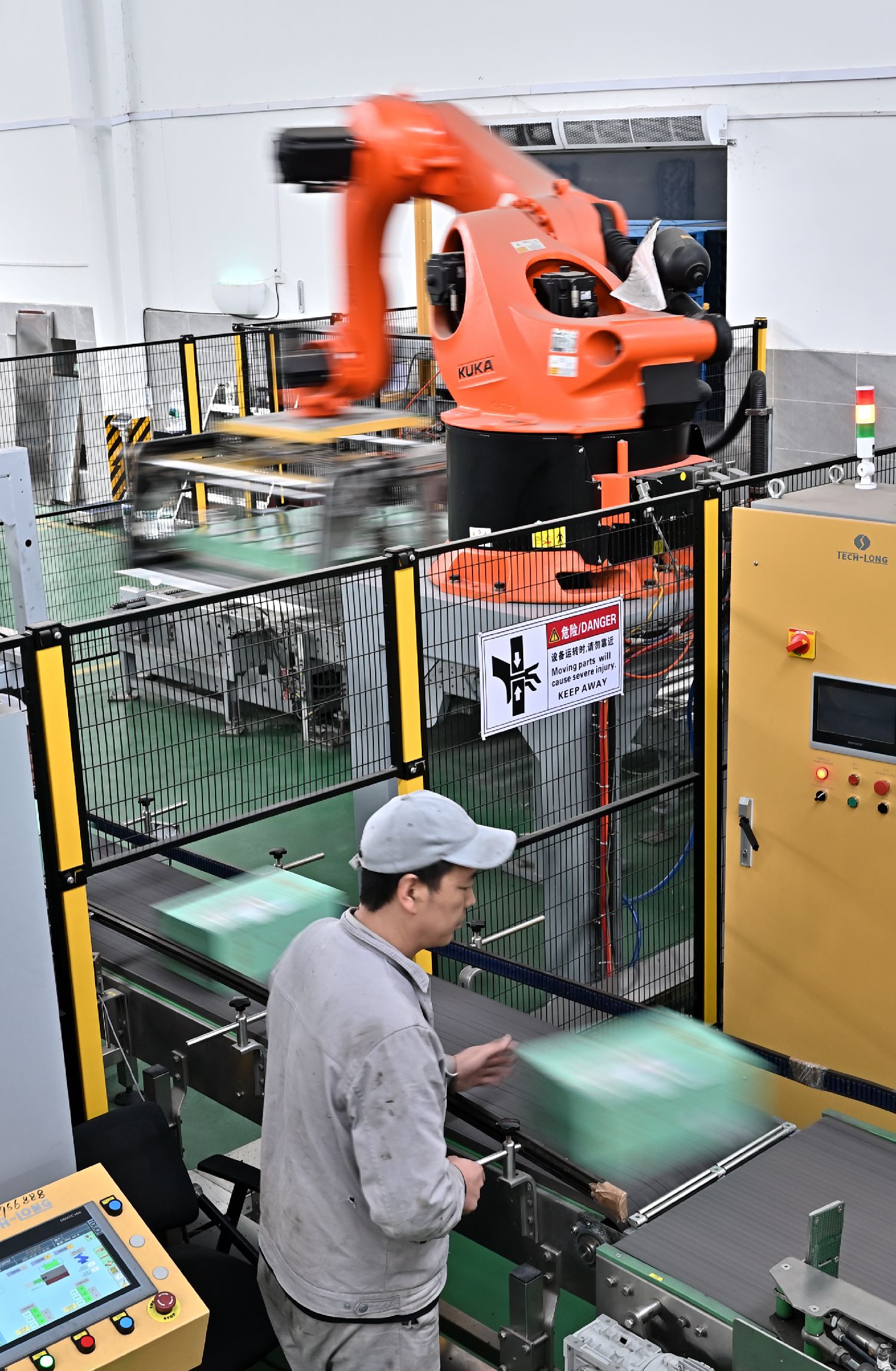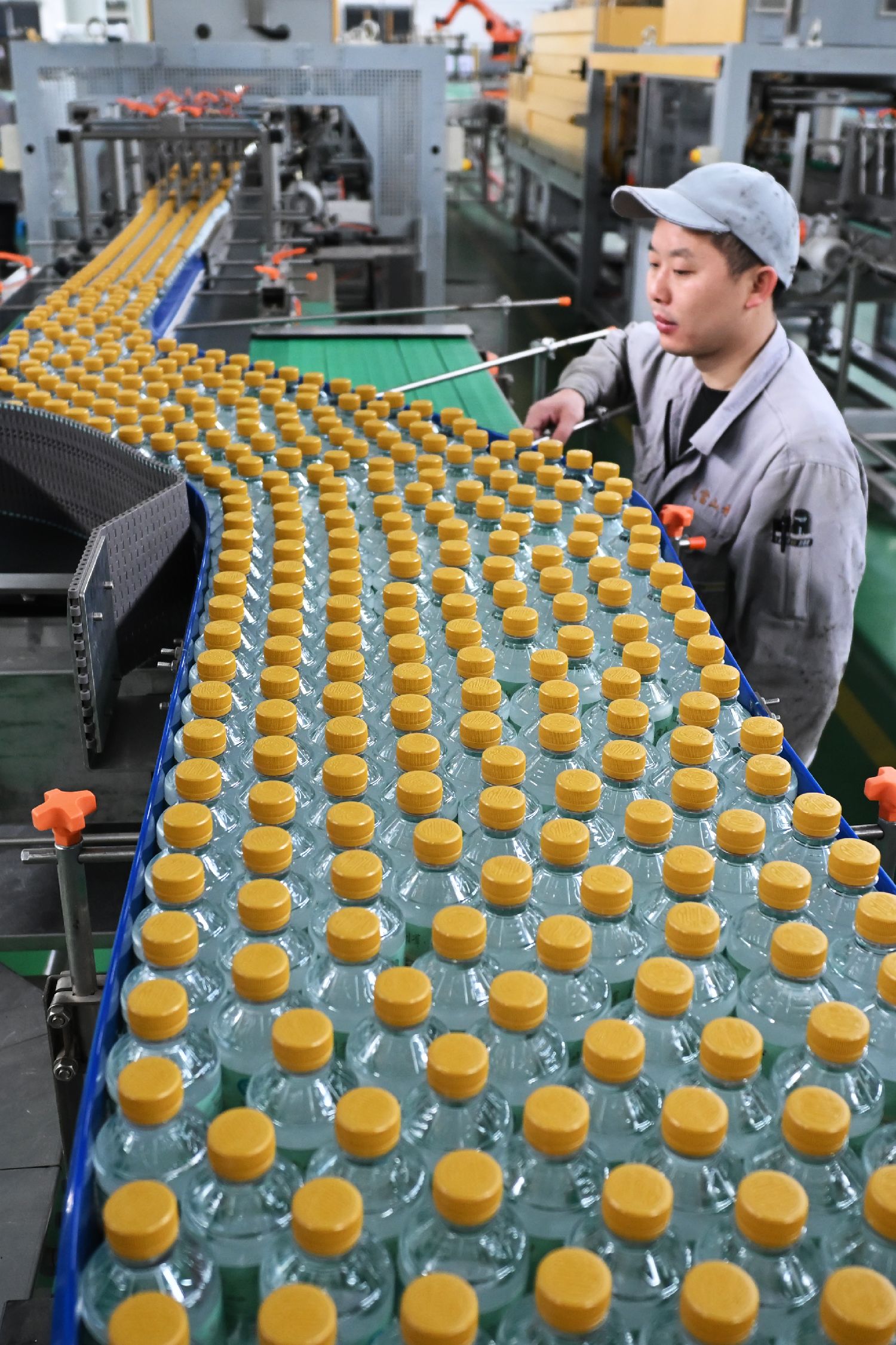 图为10月22日,湖北省丹江口市武当山水饮料公司的生产车间,工人与机器人各司其职,生产作业。